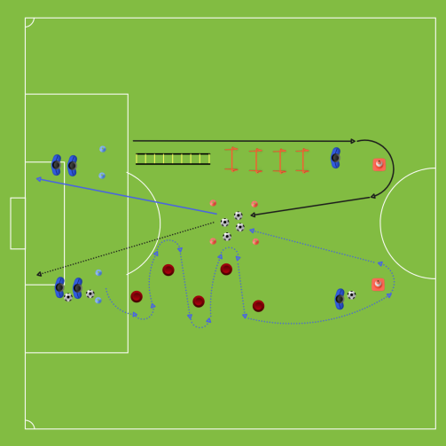 Se inicia desde ambas filas al mismo tiempo. La primera fila salta las vallas bajas con pies juntos. Luego, se desplaza lateralmente entre las picas. Realiza la coordinación en la escalera de suelo previamente definida. Finalmente, recoge el balón para conducir hasta la segunda fila. En la segunda fila hacemos zig-zag con el balón. Conducimos de cono a cono y aumentamos cada vez la velocidad. Terminamos el último tramo al 100%. Dejamos el balón en la posición inicial y vamos hasta la primera fila.