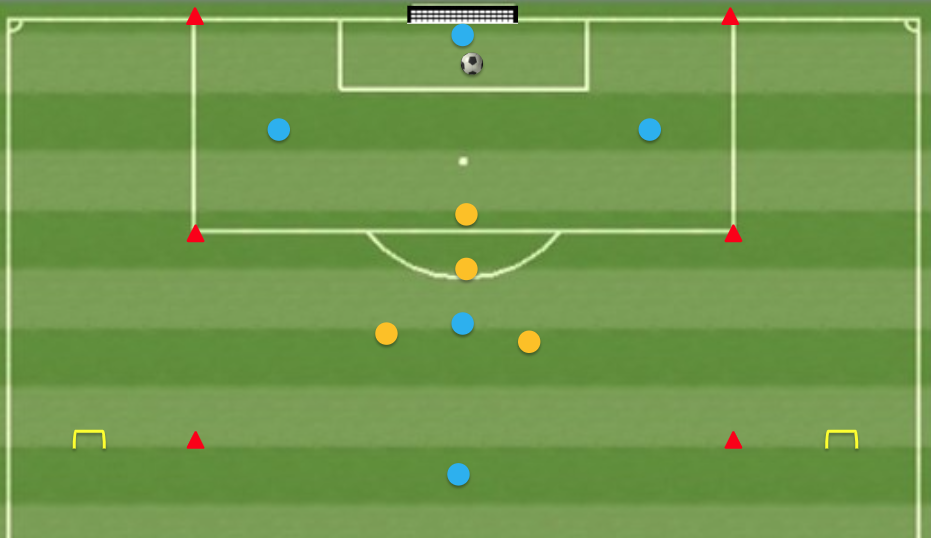 El ejercicio empieza con salida de balon en corto con el portero, haciendo en esa parte del campo un 3×1. El equipo azul tiene que llevar el balón al otro campo. Allí, con la incorporación de los dos jugadores por los lados, el pivote en el centro, el portero apoyando por detrás y el delantero por delante, tienen que dar 10 pases.