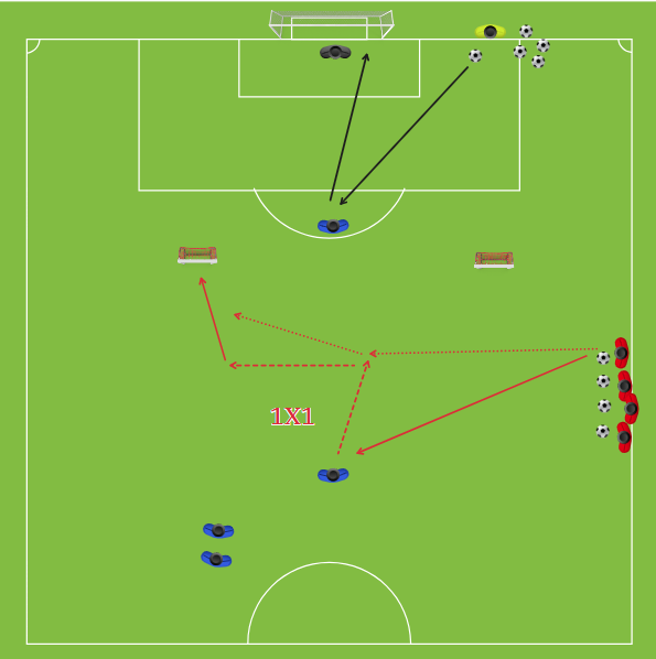 El ejercicio se inicia con un pase de un jugador rojo a otro azul, este controla e intenta marcar gol en una de las dos porterías, el jugador rojo que ha realizado el pase tiene que intentar que este no marque en ninguna de las dos porterías. Cuando finaliza la acción, tanto si es gol, robo o despeje, el jugador azul pasa a la frontal del área, donde recibirá un pase del entrenador que tiene que rematar de primeras.