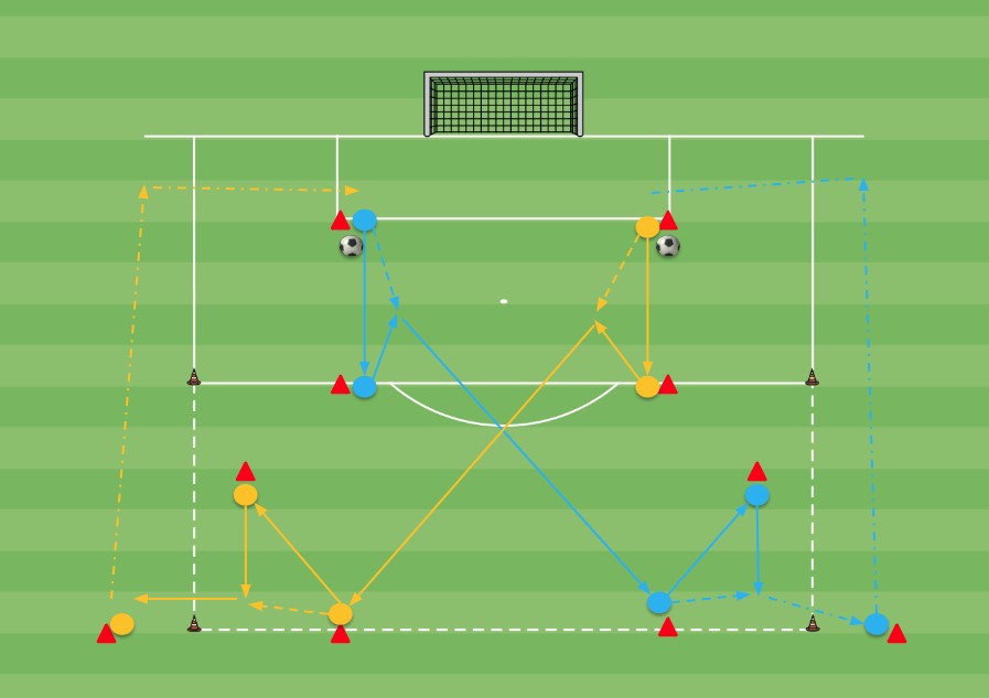 Una vez recibido el pase, realizamos un pase entre líneas al jugador que se incorpora, tras haber controlado el pase largo y pasado en corto al compañero de enfrente. Realiza control orientado y realiza pase al compañero que espera al inicio de la rueda de pases.